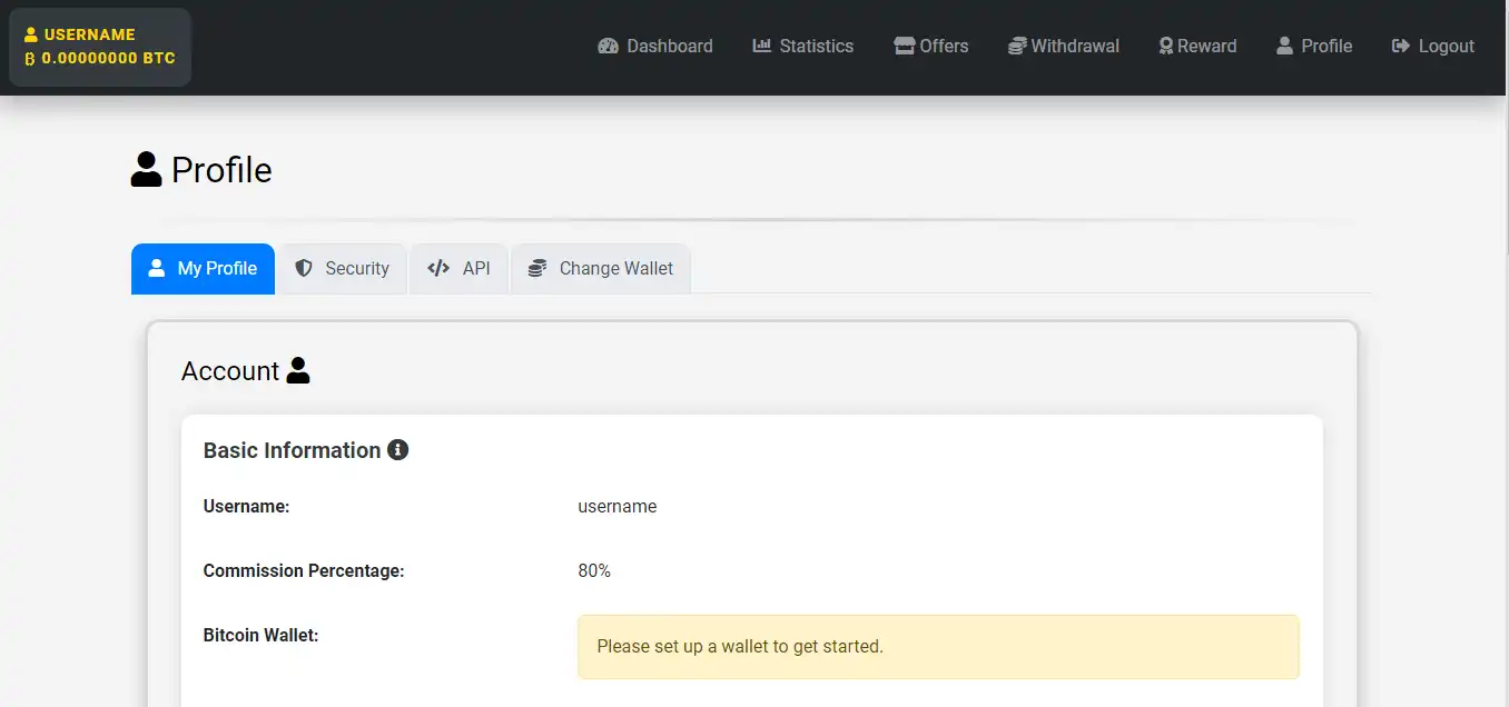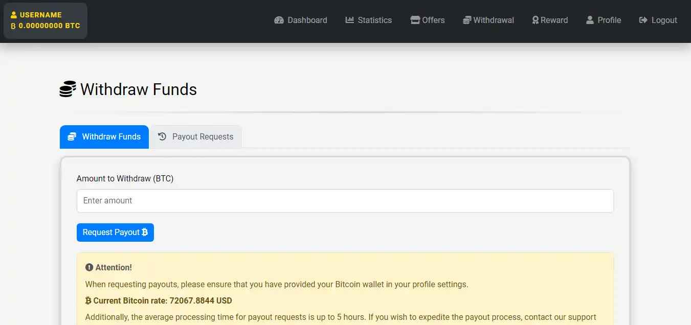 Вывод средств: В биткоинах с возможностью отображения баланса как в BTC, так и в USD. Планируется расширение списка поддерживаемых криптовалют для вывода средств. (скрин №-5)