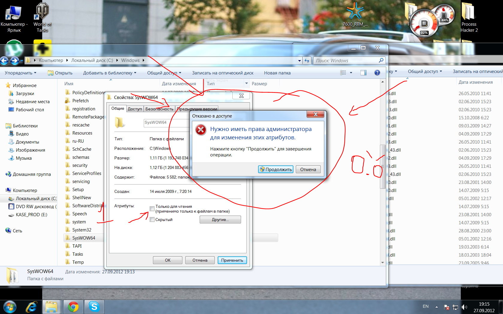 Попытался изменить доступ к папке(стоит галочка только чтение )
