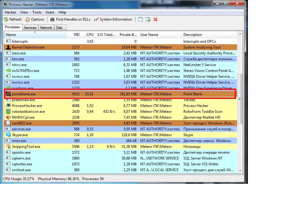2) Запускаем Process Hacker и находим процесс pointblank.exe