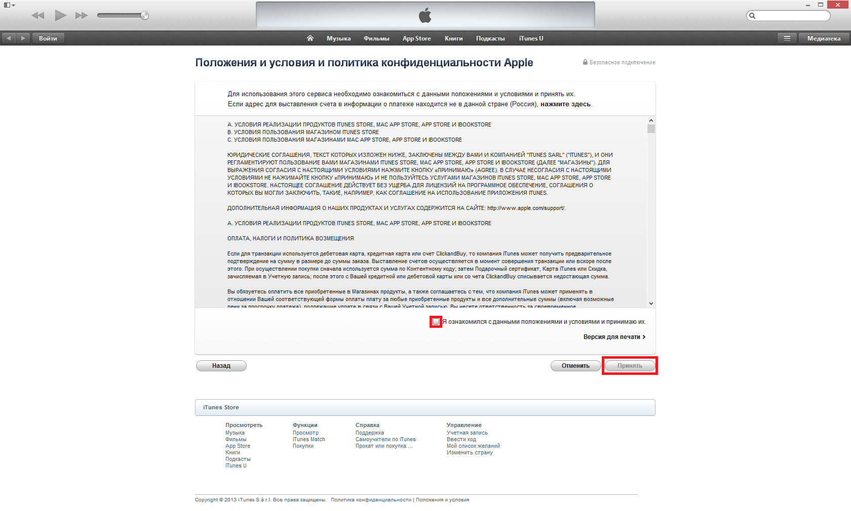 7) Внимательно читаем "Положения и условия политики Apple", ставим галочку о согласии, и нажимаем "Принять"