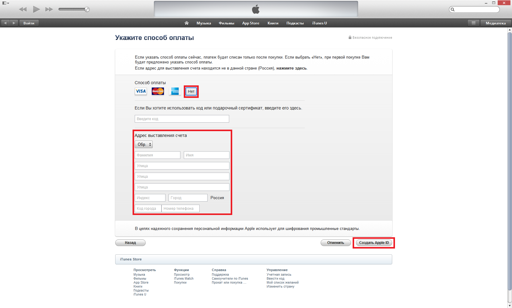 9) Указываем способ оптаны: Нет (если без кредитки), заполняем "Адрес выставления счета" (желательно действительно существующий). Жмем "Создать Apple ID"