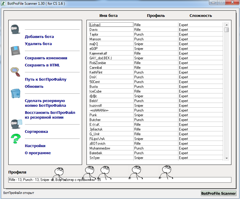 Программа предназначена для более удобного изменения содержимого BotProfile.db, содержащего информацию о ботах в Counter-Strike 1.6 и Source.