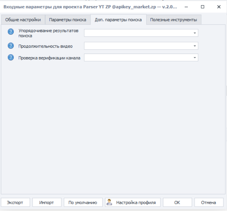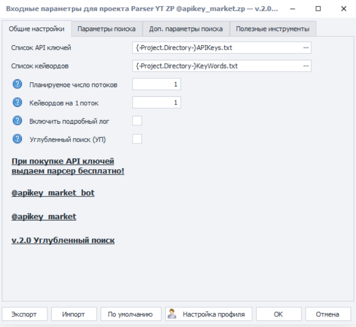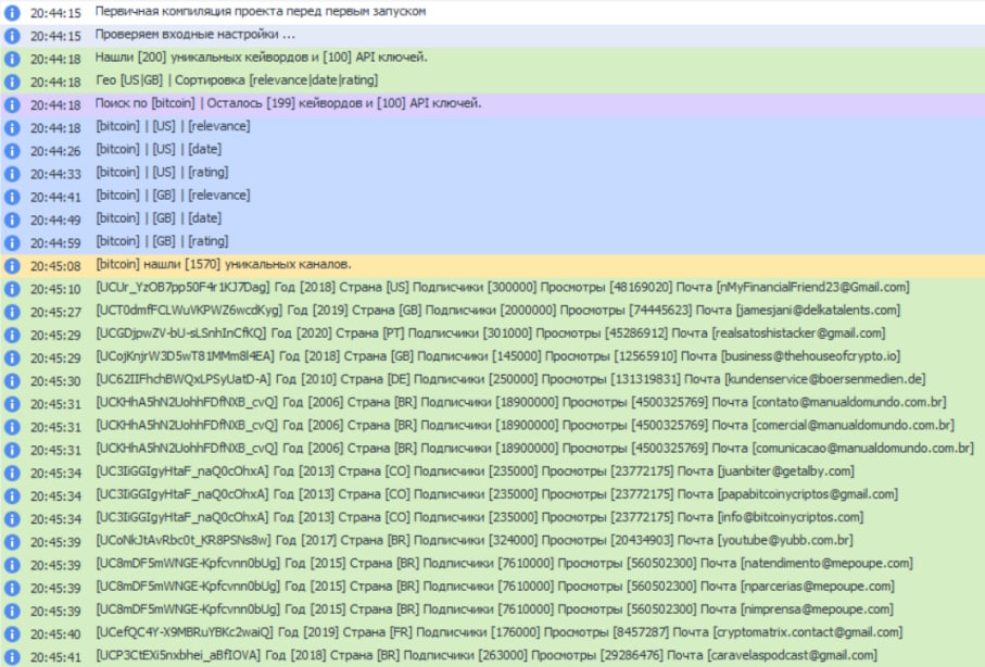 - парсит через ключи YouTube Data API (их можно приобрести здесь YouTube Data API)