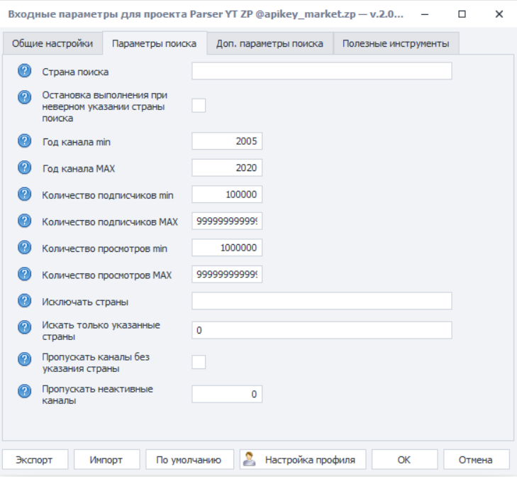 - парсит по году, подписчикам и просмотрам канала (указываете min и MAX)