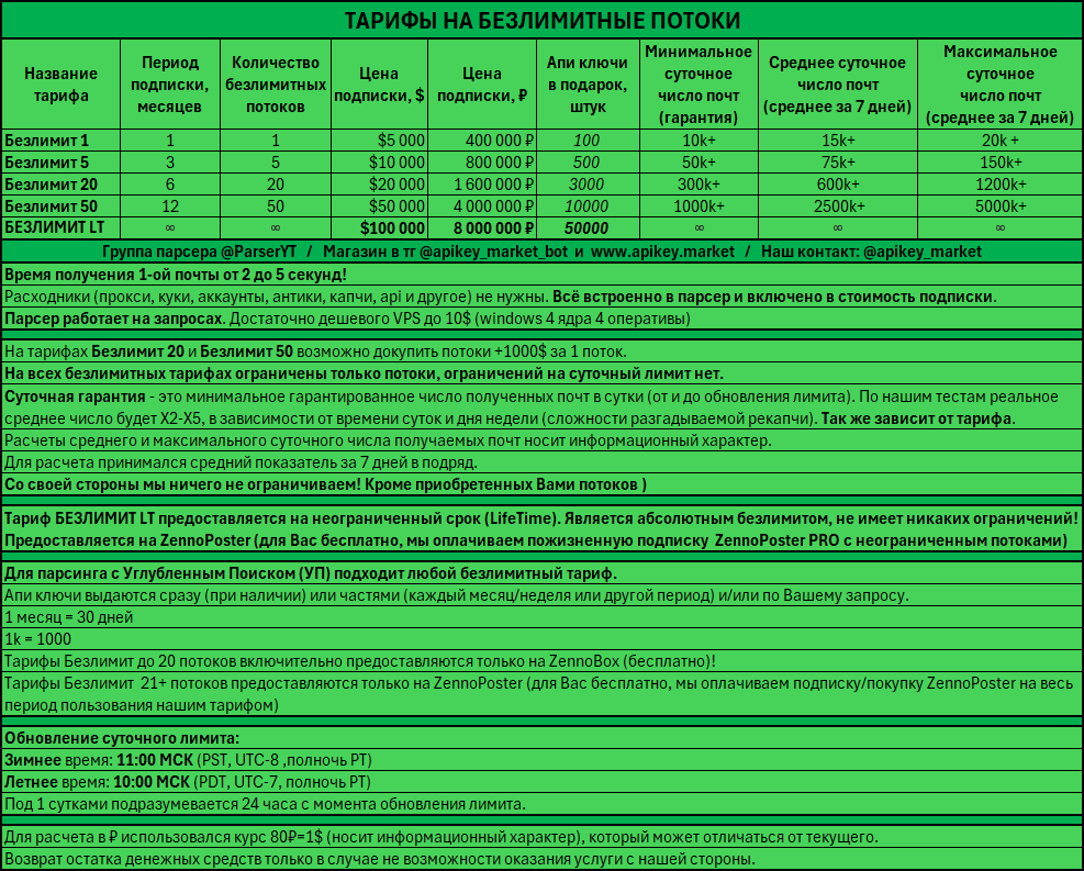 - расходники (прокси, куки, аккаунты, антики, капчи, api и другое) не нужны! Всё встроено в парсер и включено в стоимость подписки.