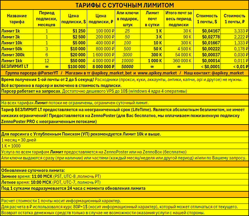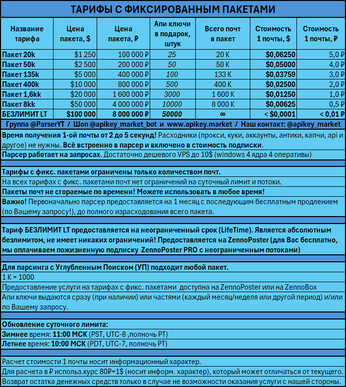 Во всех тарифах включен Углубленный поиск (УП) и другие функции парсера без каких-либо ограничений (кроме приобретенного вами объема почт из под кнопки/рекапчи)!