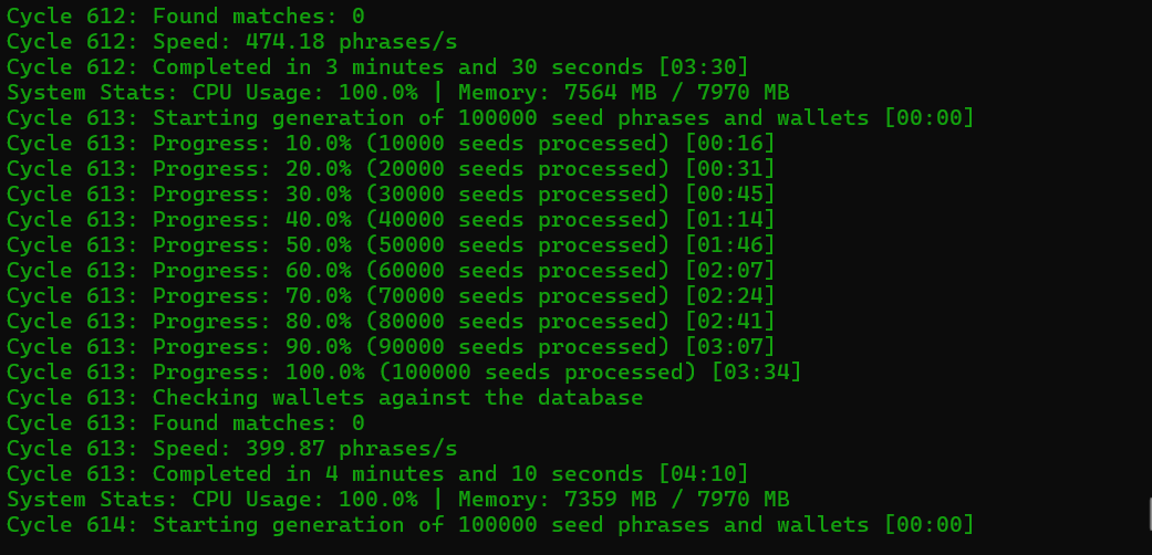 Seed Miner достигает невероятной скорости: seed-фраз в секунду или приватных ключей в секунду на мощных системах, благодаря многопоточной обработке с библиотекой Rayon. Прогресс отображается через стильный прогресс-бар, а результаты сохраняются в подробных логах.