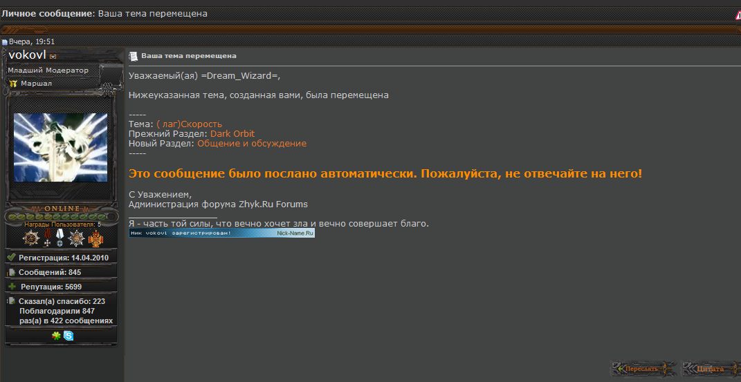 vokovl в теме написал все го лишь одно сообщение хотя он должен отвечать за свои действия а не воланд