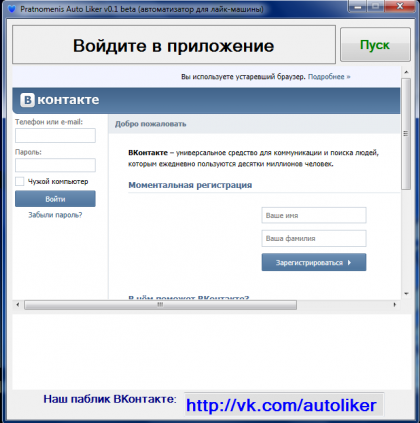 Прочитав эту тему решил дополнить. Программа AutoLiker предназначена для приложения [Ссылки могут видеть только зарегистрированные пользователи. ]. В этом приложении можно заработать лайки. Конечно,уже существует множество программ для накрутки "Мне нравиться" в соц. сети Вконтакте. Я лично пользуюсь данным приложением,потому что через него накрутка идет быстро и лайки ставят реальные люди. То есть риска бана не существует. Теперь перейдем к делу. Качаем программу AutoLiker(ссылка внизу)