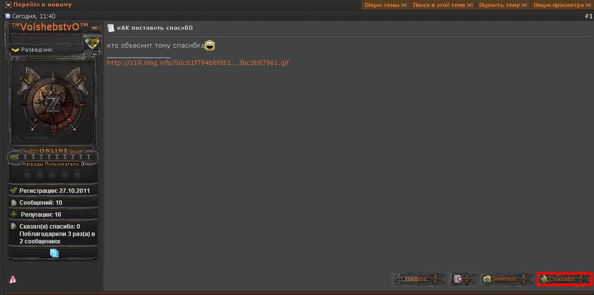 вам не надоело плодить бесполезные темы,неужели нельзя запомнить, что кнопка [Ссылки могут видеть только зарегистрированные пользователи. ]спасибопоявиться в правом нижнем углу, после того как вы наберете 10 сообщений[Ссылки могут видеть только зарегистрированные пользователи. ] а сколько у тебя сообщений ты увидишь снизу авы[Ссылки могут видеть только зарегистрированные пользователи. ]