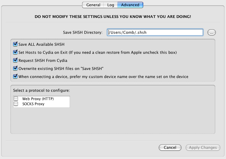 Set Hosts on Cydia on Exit - Оставлять настройки переадресации в фале Hosts на сервер Cydia после выхода. Довольно удобно, если у вас есть SHSH то при выключенной TinyUmbrella вы все равно сможете восстановиться используя сервер Cydia вместо локального TSS.
