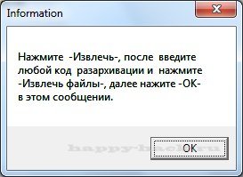 4. Нажимаем "Извлечь", далее вводим любой код, не важно, просто ведите цифры, например 1, и нажимаем "Извлечь файлы" потом окно зависает, и в другом маленьком окне мы нажимаем "Ок", после чего выходит что мы ввели неверный код разархивации, и сразу же появляется окно с кодом, вводим код и успешно получаем файл