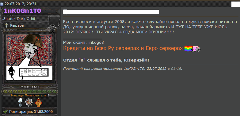 Мальчик,попав на форум,сразу пошел в раздел "Баги и читы L2" И начал пытаться что-то сделать,но у него ничего не выходило надо было зарегистрироваться.После регистрации он сделал твинка и начал пробовать делать на нем баги,но ничего не выходило.Спустя 7 дней своего "упорства" у мальчика получилось делать баги и он сразу же начал баговать свою основу.Пробаговал и думает "-А Где я его продам?" Но зайдя на форум и опустившись на низ форума он увидел раздел "Черный рынок L2" И нераздумывая создал тему "Продам перса л2 за 20к (подумал он т.к аккаунт еще и баговался) и свои данные оставил и к нему добавился какой-то новичок на сайте,который ничего не понимал."Халявные 20к" - Подумал мальчик.После сделки мальчик чуть не невалил в трусы от счастья.