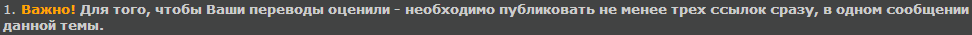 1. Важно! Для того, чтобы Ваши переводы оценили - необходимо публиковать не менее трех ссылок сразу, в одном сообщении данной темы.