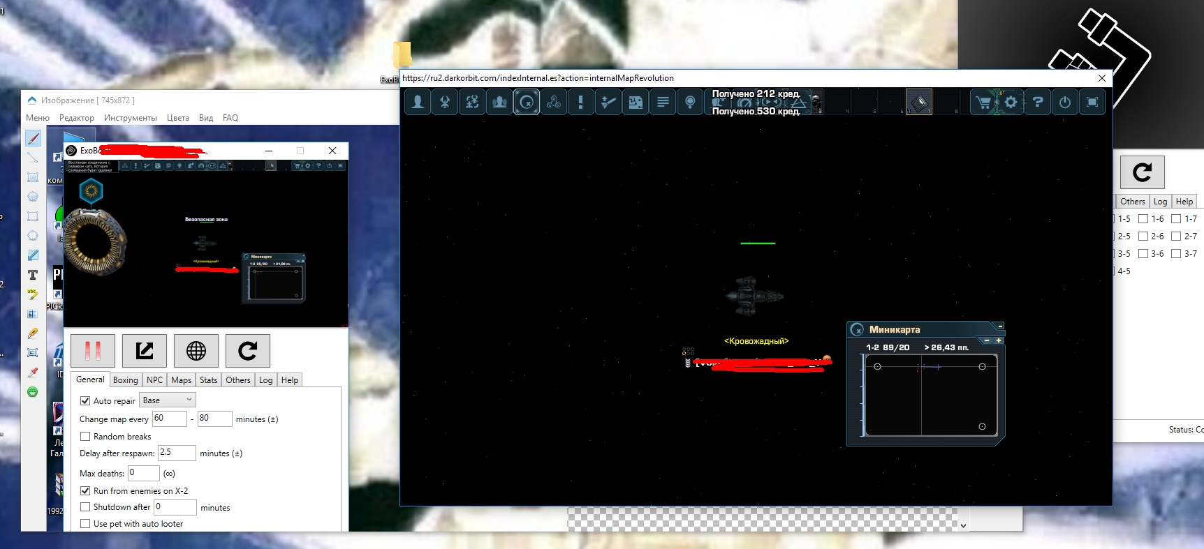 Всем привет! Версия бота 2.3.0.4, ставлю на битье мобов. как с выбором конкретных мобов, так и всех подряд. Как только кораблик подлетает к мобу, бот зависает и даже если его убрать из процессов, он все равно остается на экране. Если кто-нибудь ставит на мобов, у вас он работает. если да, то какие галочки в настройке ставите?