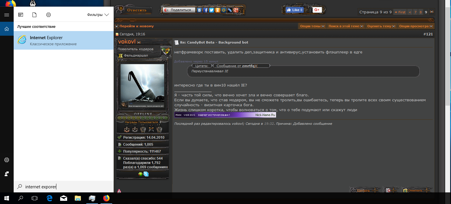 ну вот и дальше юзайте винду где установлен IE, чем больше таких, тем меньше ботеров мешает мне, одно другому не мешает, но кто то юзает кривые версии винды, так как ИЕ прекращён в 10