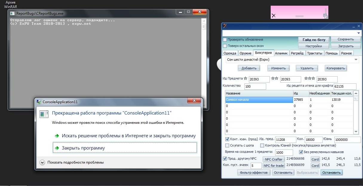 Еще когда я ставлю галочку на Контроль юаней бот во время крафта постоянно переключает таргет на торговца и обратно из-за этого крафт очень долгий, а когда в инвенторе юаней больше 150000000 персонаж подбегает к торговцу, видимо пытается убрать Юани, но не получается и он начинает бегать туда сюда без остоновки)